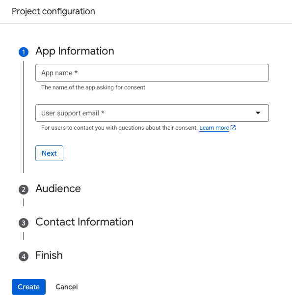 If you’ve created a new project, you’ll be asked to create an app by entering some details like App Name, User Support Email, etc. You need to complete this form. In the “Audience” step, choose “External“.