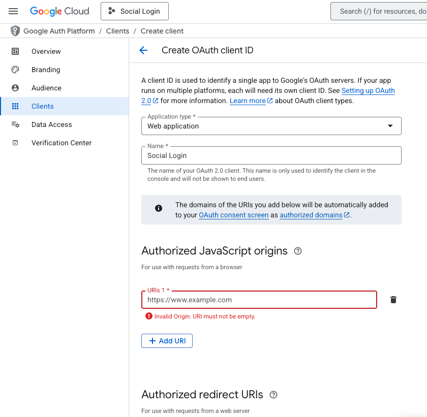 3. In the Authorized JavaScript origins, add the site URL without any subdomains. This domain should be the same as the domain of the site on which Login Form is used. Finally, click the “Create” button.